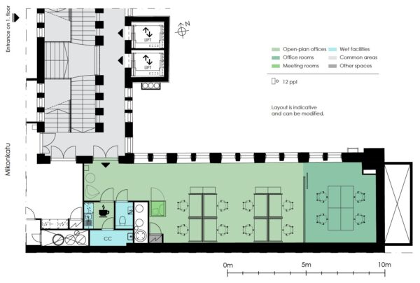 The property consists of two buildings, one on Mikonkatu and the other on Vilhonkatu. The buildings are partially connected. Both buildings have five floors and three underground levels. The first two floors consist of retail space and the upper floors office space. The premises of this magnificent historic property, completely renovated for modern office use, provide a superb setting for companies of any size. The premises also feature restored original elements, such as a splendid staircase and an old ceramic stove. The property offers both traditional office space and adaptable open-plan office space. Thanks to the central location, the commercial and corporate services of the city centre are all within a short walking distance.