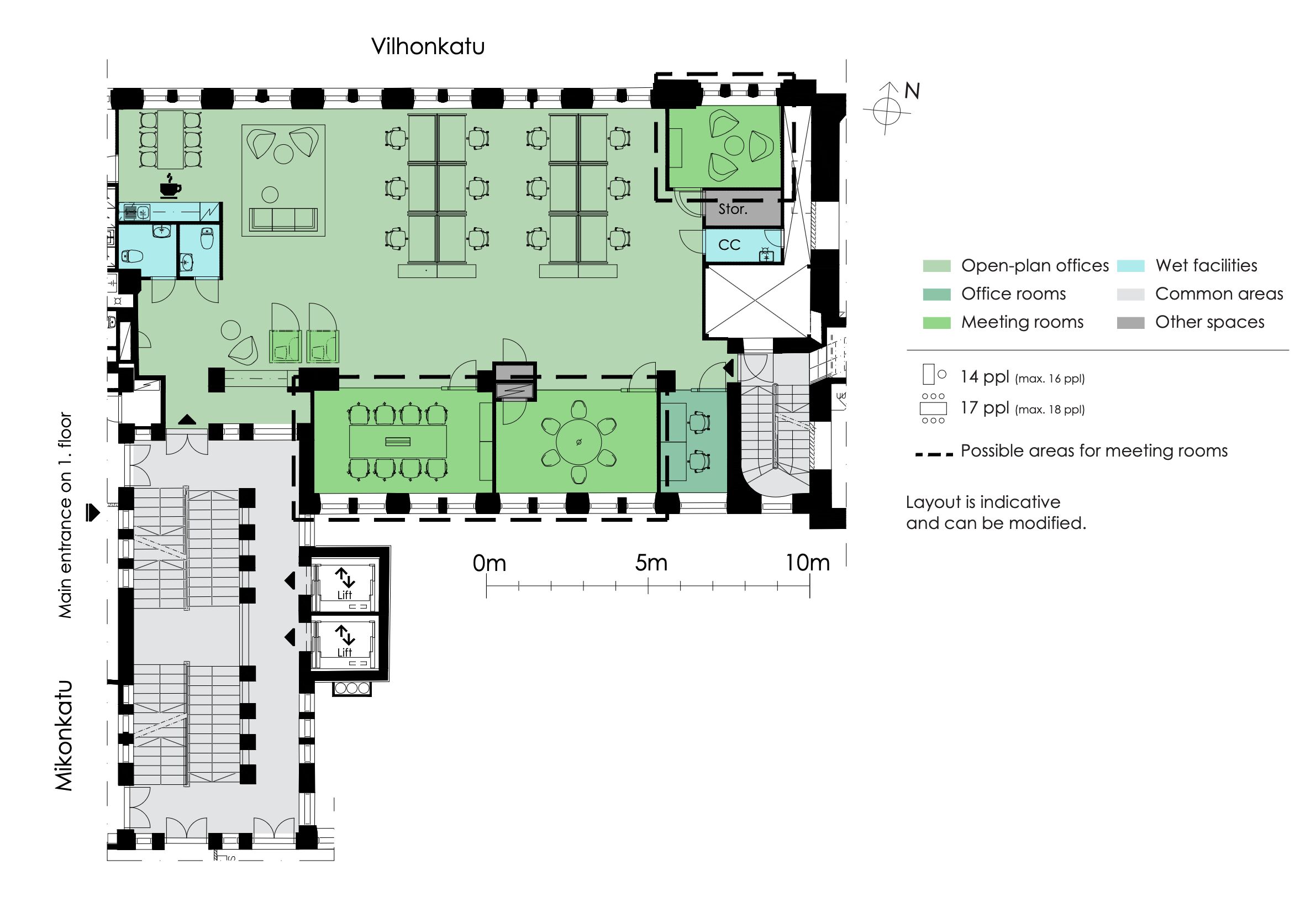 The property consists of two buildings, one accessible from Mikonkatu and the other from Vilhonkatu. The buildings are partially connected to each other. There are retail spaces on the ground floor and office spaces on the upper floors. The fully renovated spaces, which reflect the property's history, provide an excellent setting for various companies. The property offers both traditional office rooms and easily adaptable open-plan spaces.