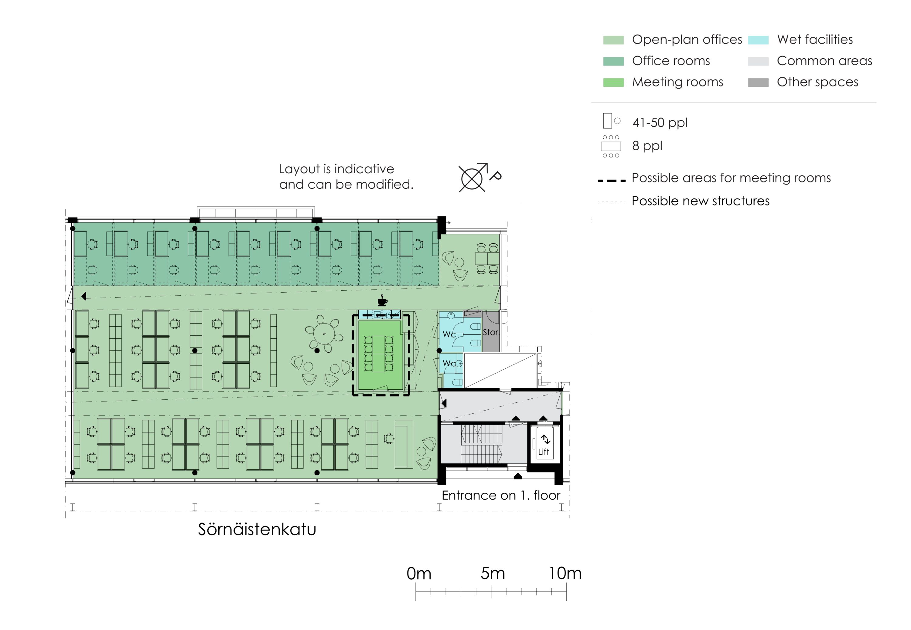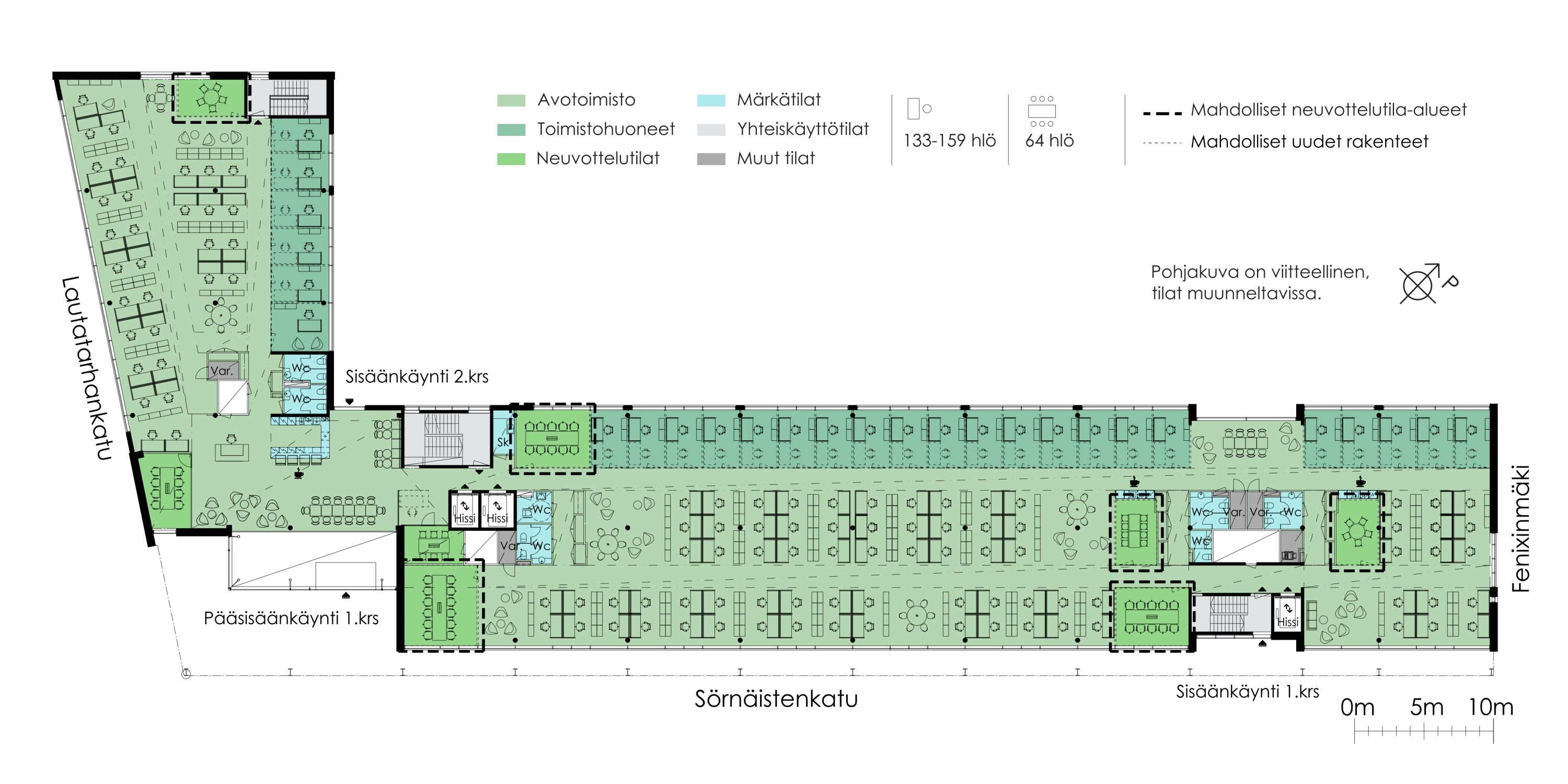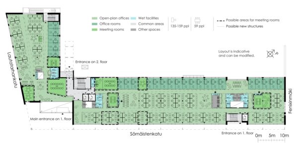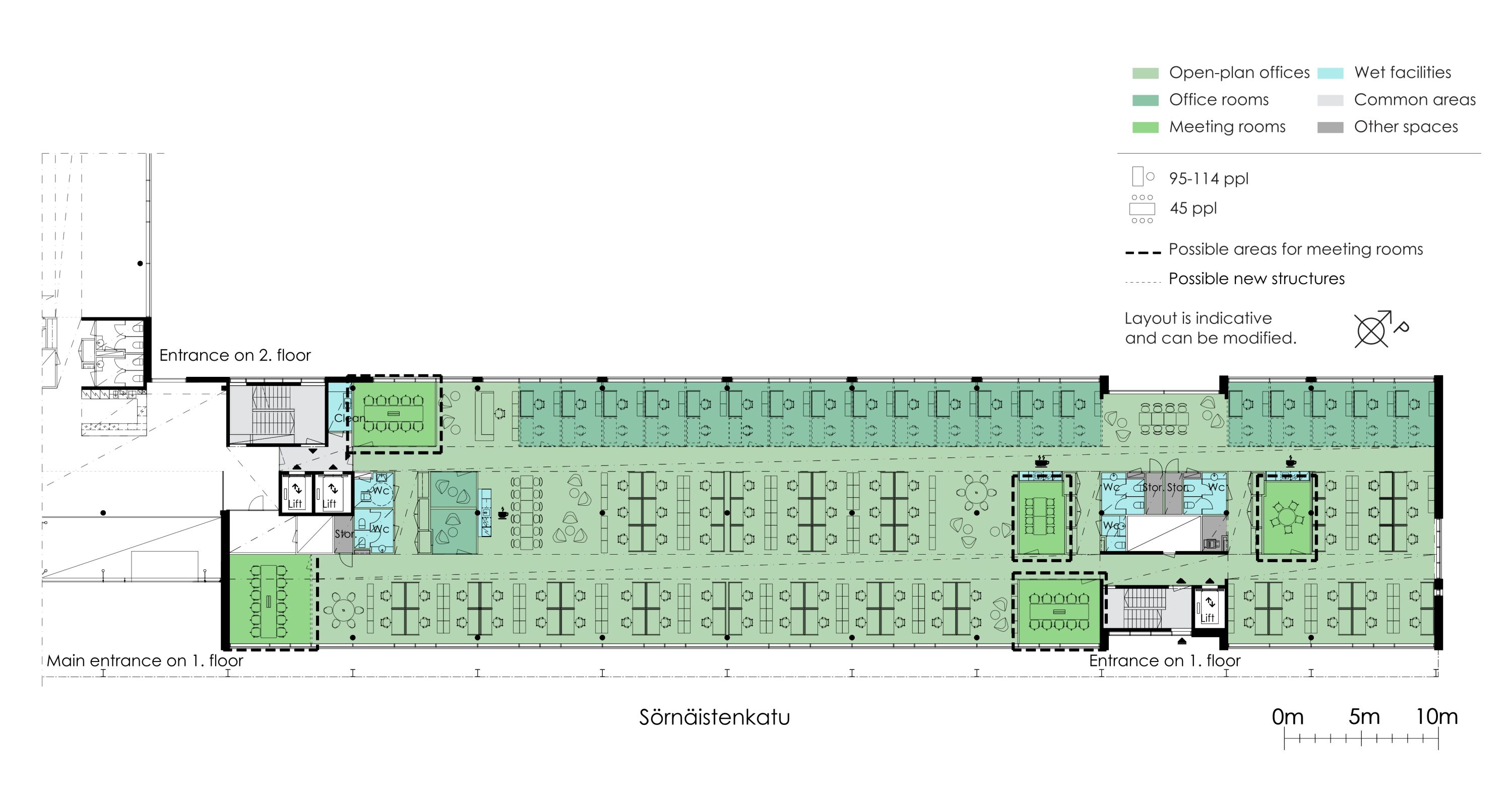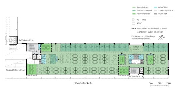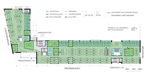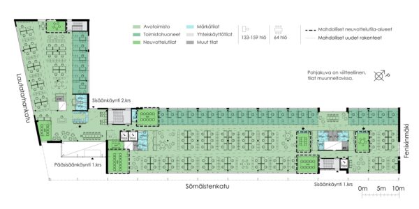A versatile and environmentally friendly office building in the heart of Sörnäinen offers a comfortable working environment, where services support the smooth running of everyday life. The building has a lobby service, a gym and newly renovated meeting rooms. In addition, the property has its own bakery and lunch café. The top floor has sauna facilities and a roof terrace, which bring additional comfort to working days. The property's own parking garage provides direct access to the office floors, making it easier to get around.