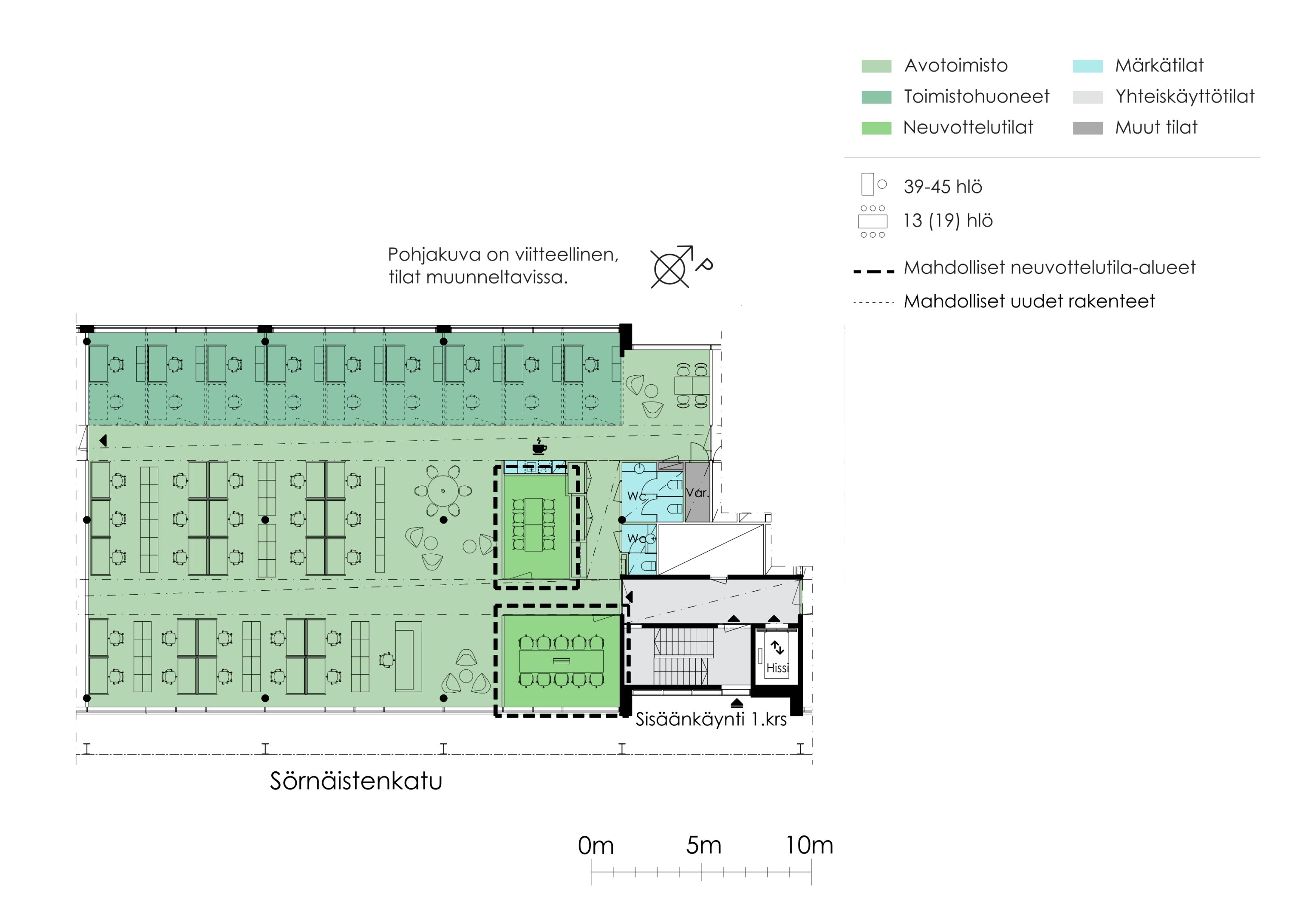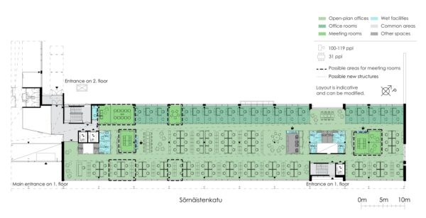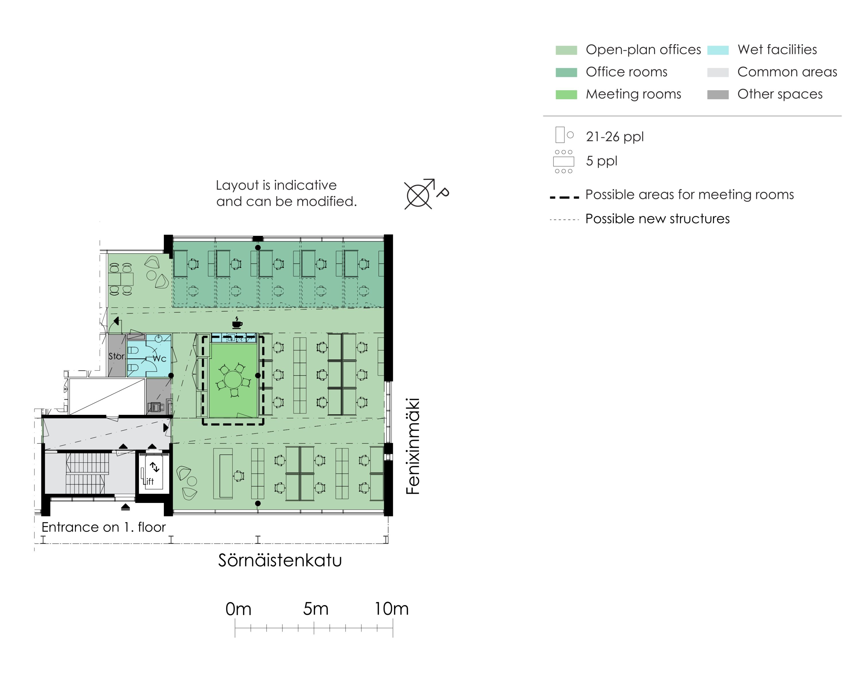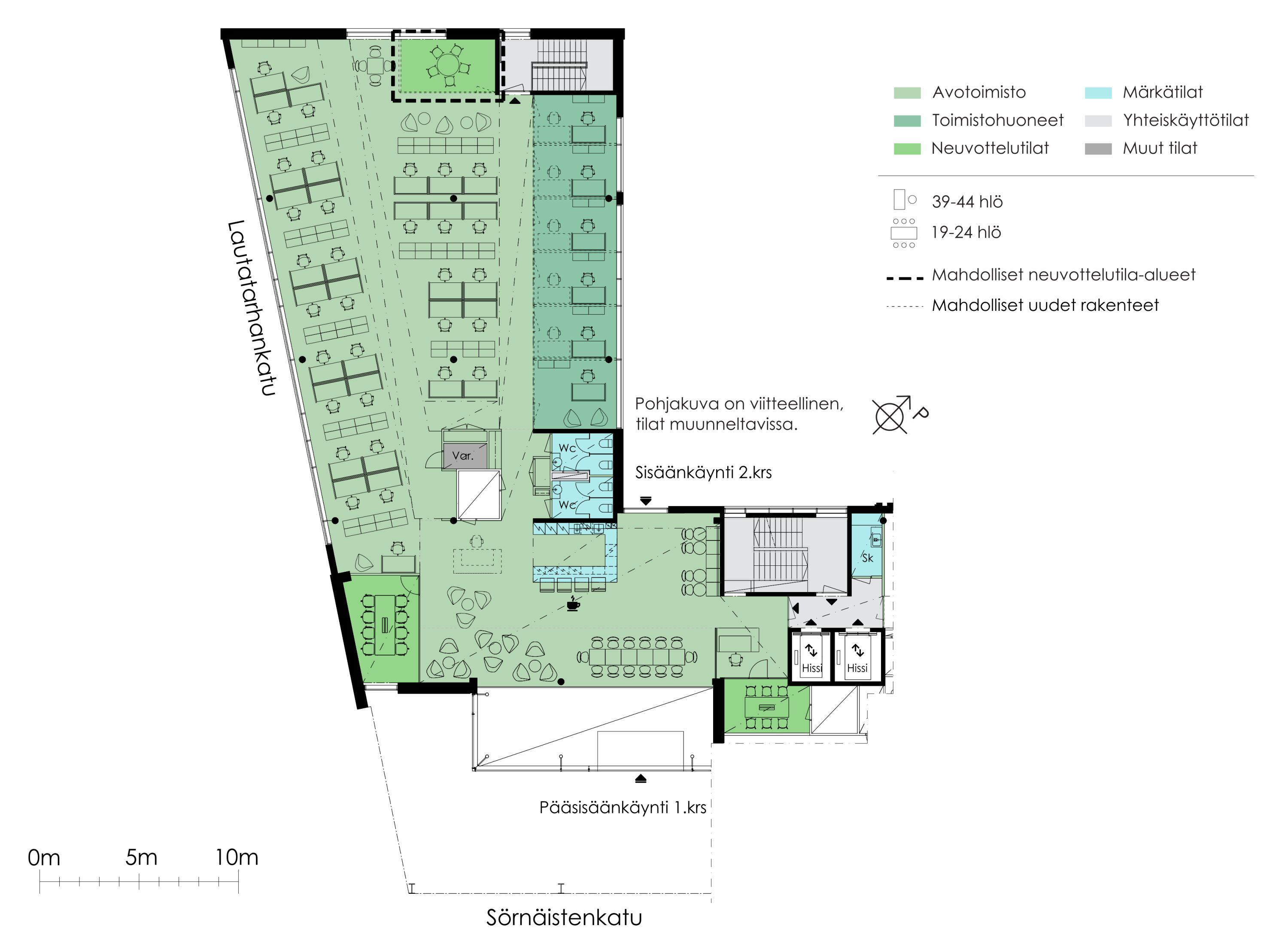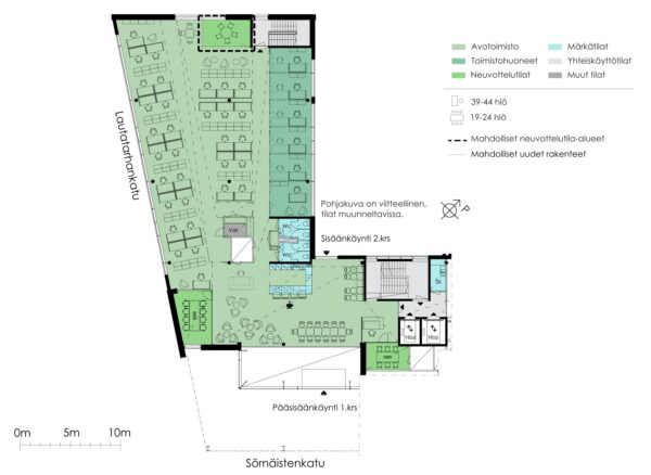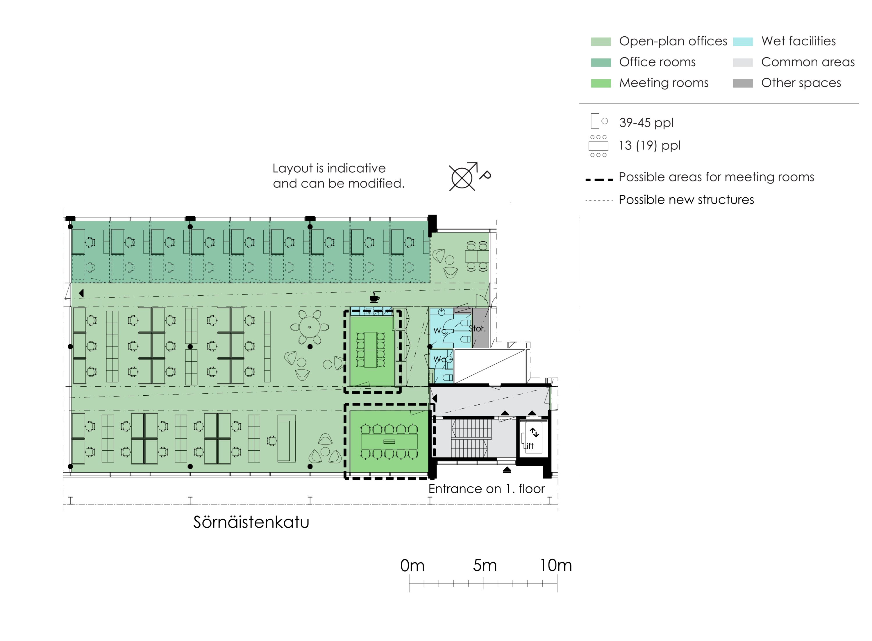A versatile and environmentally friendly office building in the heart of Sörnäinen offers a comfortable working environment, where services support the smooth running of everyday life. The building has a lobby service, a gym and newly renovated meeting rooms. In addition, the property has its own bakery and lunch café. The top floor has sauna facilities and a roof terrace, which bring additional comfort to working days. The property's own parking garage provides direct access to the office floors, making it easier to get around.