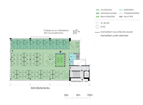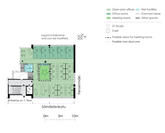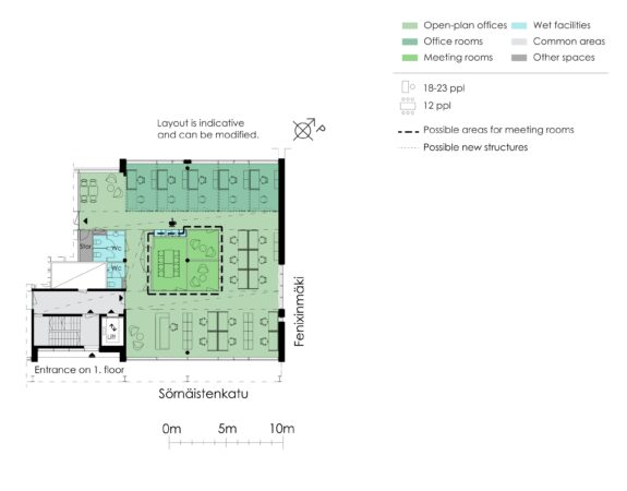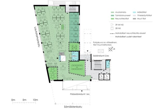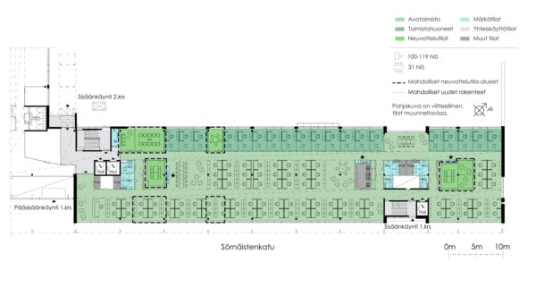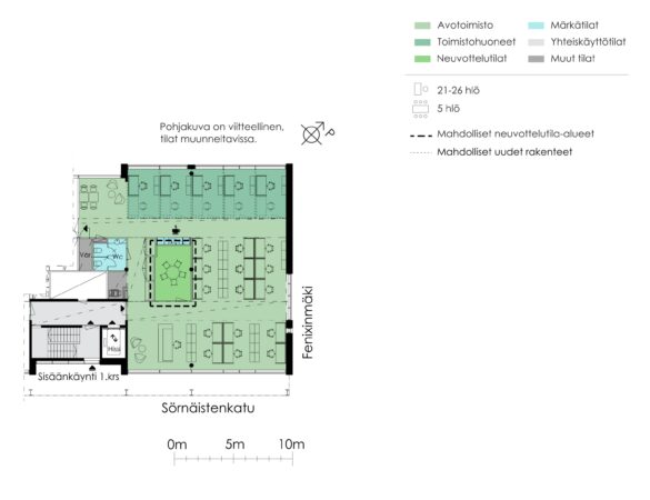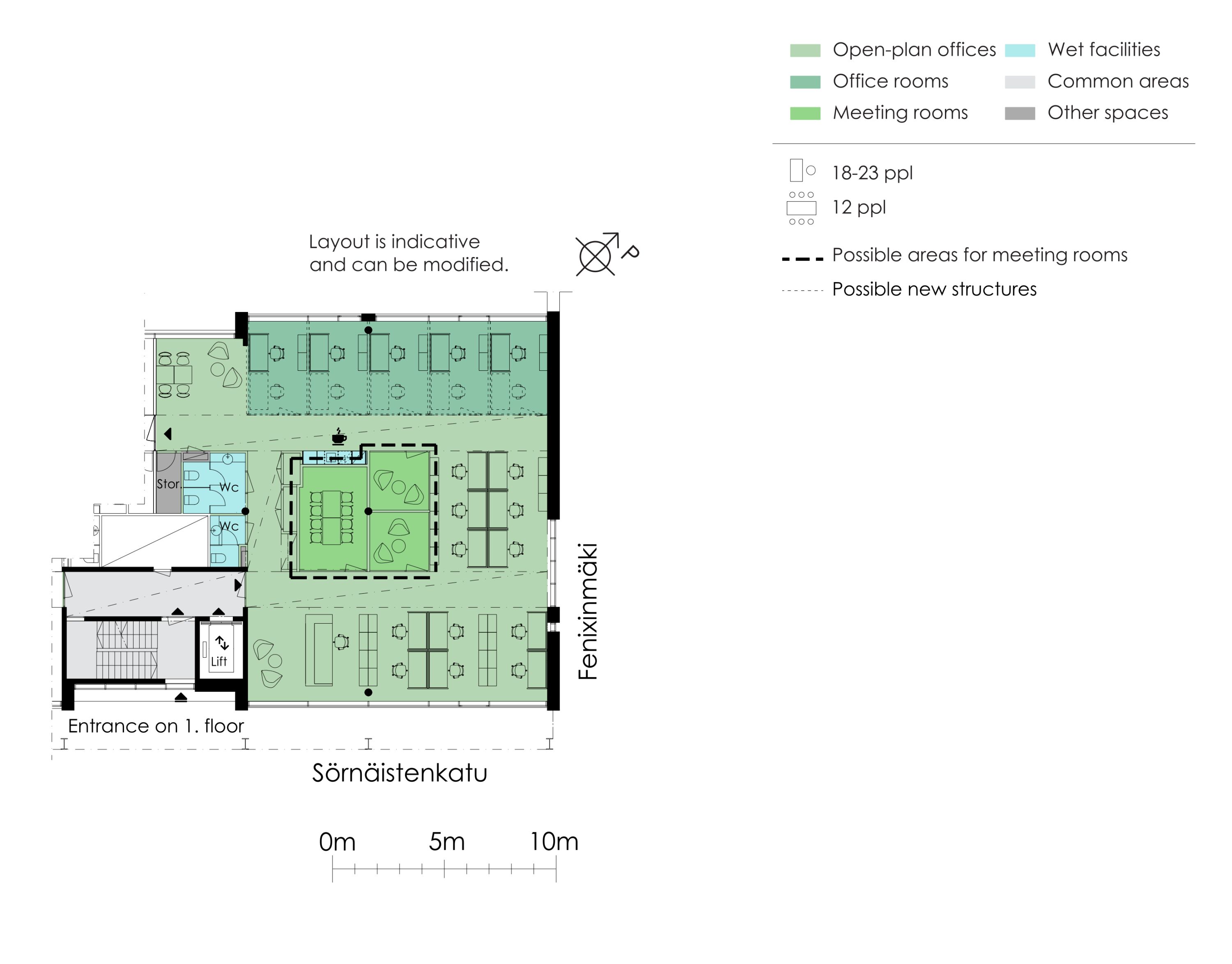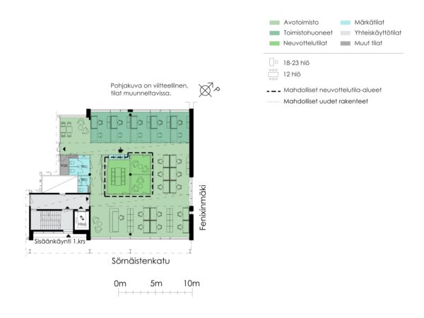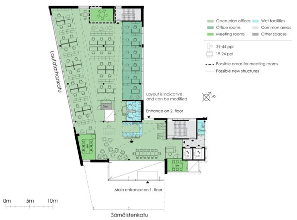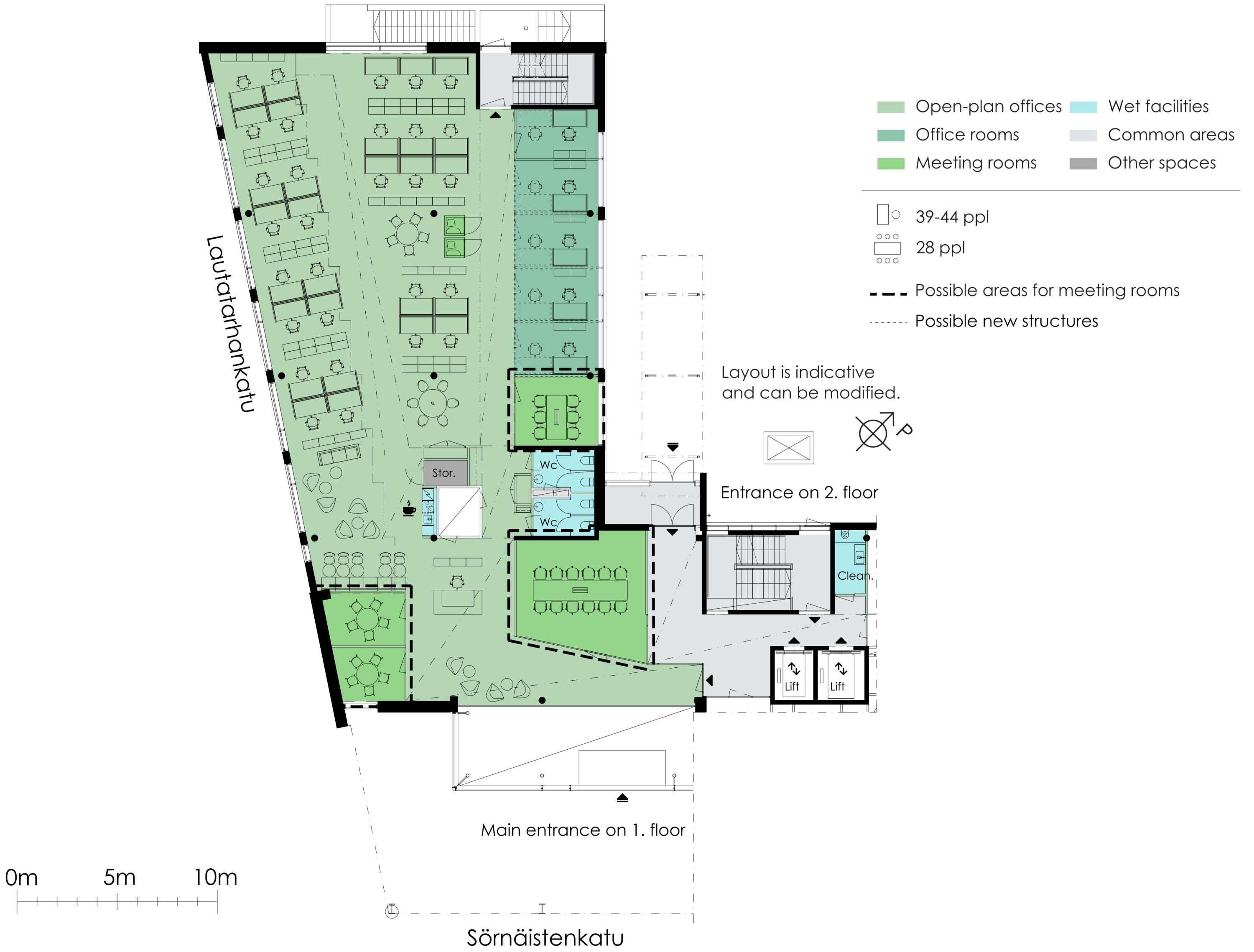 A versatile and environmentally friendly office building in the heart of Sörnäinen offers a comfortable working environment, where services support the smooth running of everyday life. The building has a lobby service, a gym and newly renovated meeting rooms. In addition, the property has its own bakery and lunch café. The top floor has sauna facilities and a roof terrace, which bring additional comfort to working days. The property's own parking garage provides direct access to the office floors, making it easier to get around.
