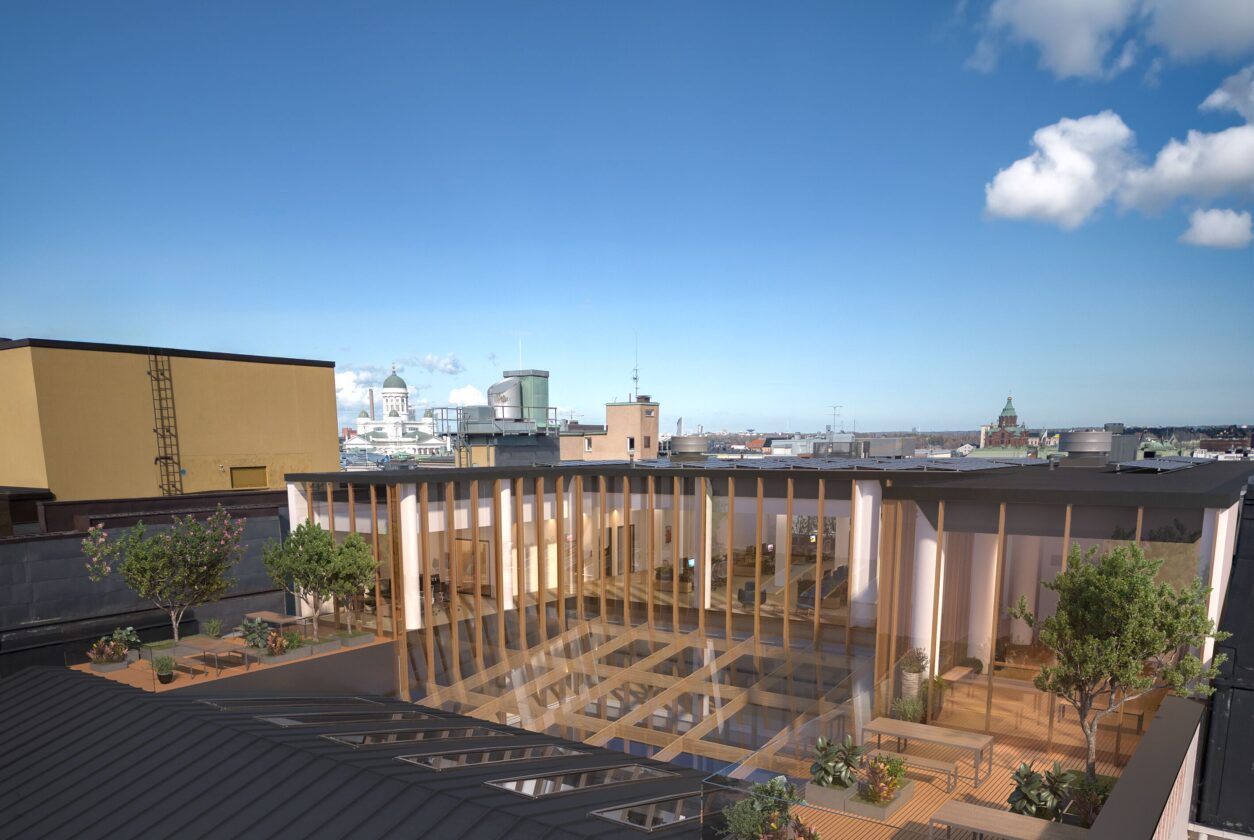 Ylimpään kerrokseen voidaan toteuttaa esimerkiksi avotoimistoa, taukotilaa, loungea sekä saunatilat. Kerroksesta löytyy myös kaksi upeaa kattoterassia. Tilaratkaisut toteutetaan toiveiden mukaan.