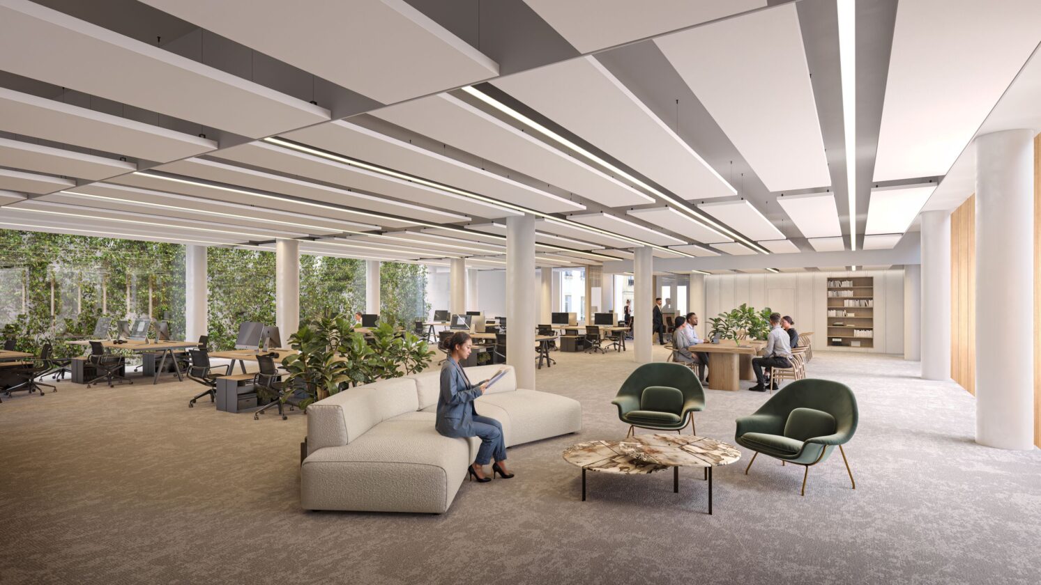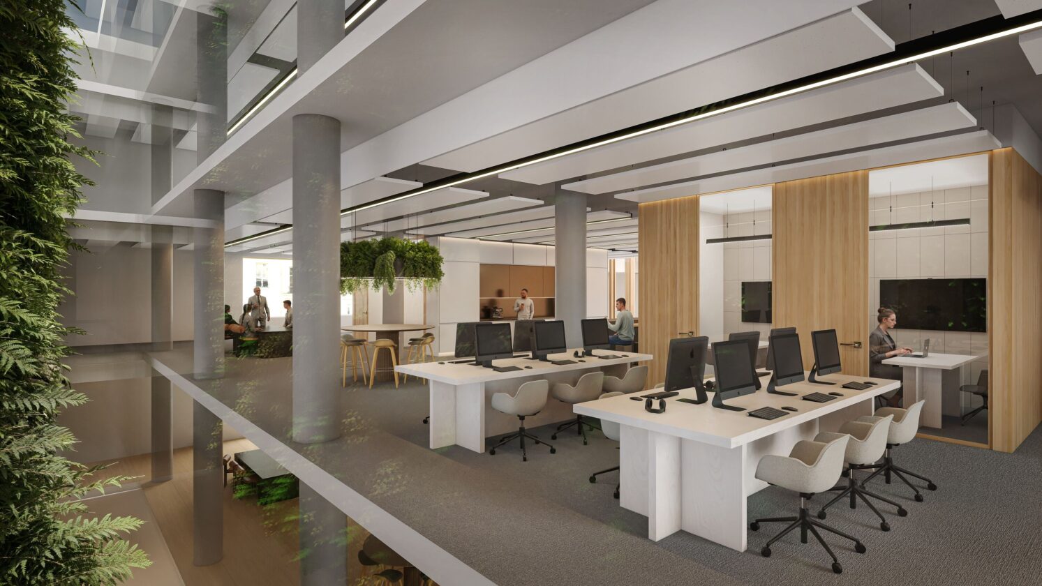 5. kerroksen muuntojoustavaa toimisto- ja neuvottelutilaa. Tilojen välille on mahdollista rakentaa näyttävä sisäporras. Keskellä kerrosta oleva atrium tuo tiloihin lisää luonnonvaloa. Tilaratkaisut toteutetaan toiveiden mukaan.