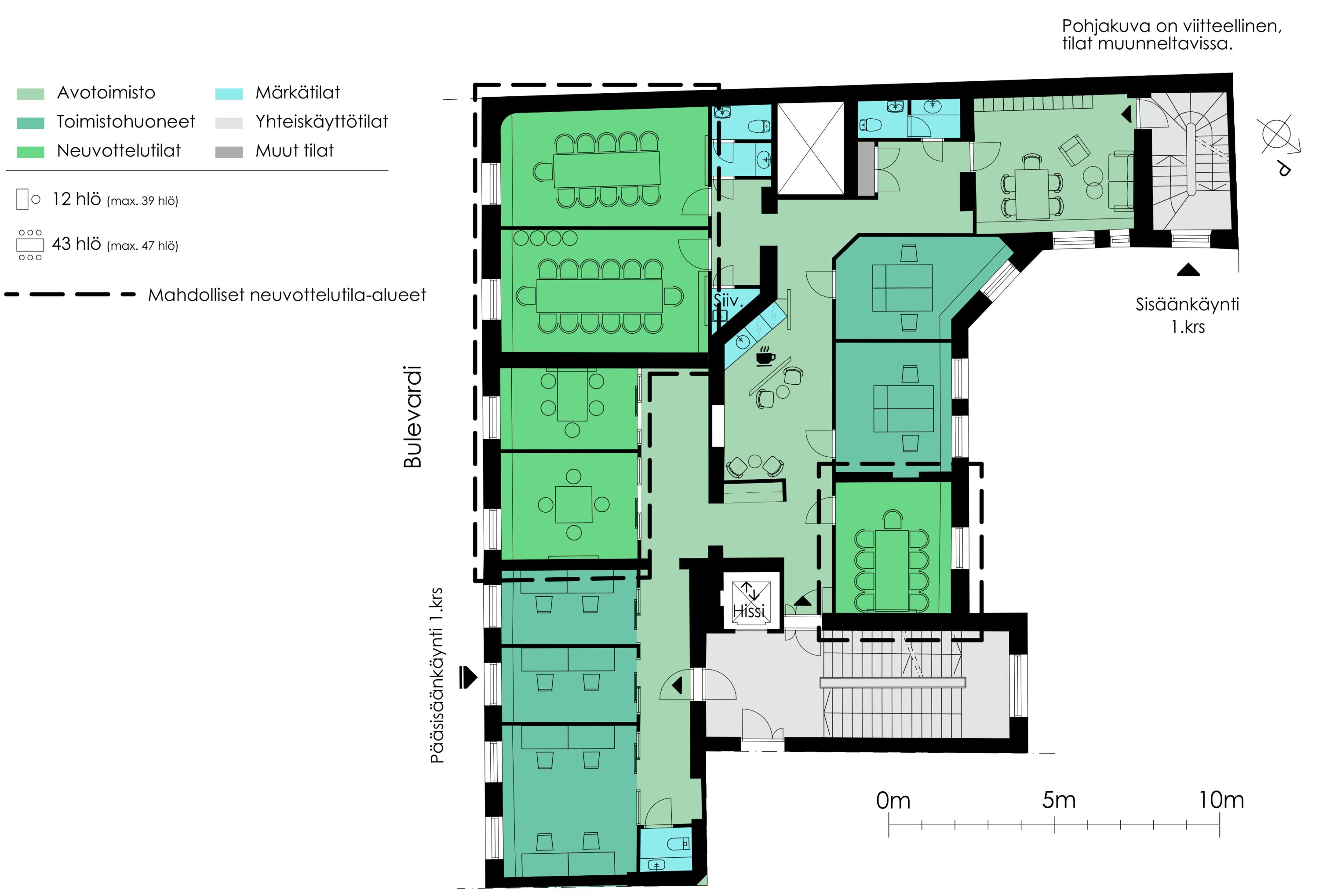 Alun perin viehättävänä asuinrakennuksena toiminut kiinteistö on muokattu tehokkaasti toimitilakäyttöön sopivaksi.